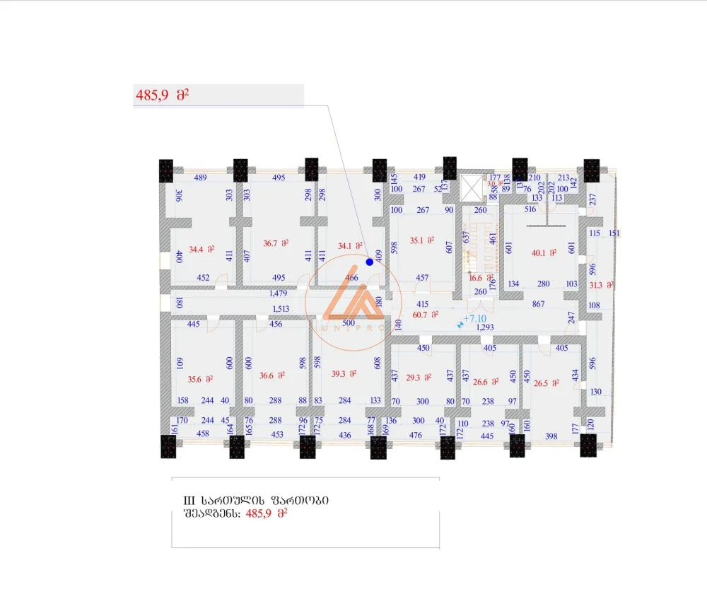 ქირავდება 486 კვ მ საოფისე ფართი: 10 ოთახი. ფართს აქვს დერეფნული სისტემა და ყველა ოთახს აქვს ინდივიდუალური შესასვლელი. არის 2 სველი წერტილი. იდეალური არის საოფისე ფართისთვის . დამატებითი ინფორმაციისთვის დაგვიკავშირდით თ.ლ