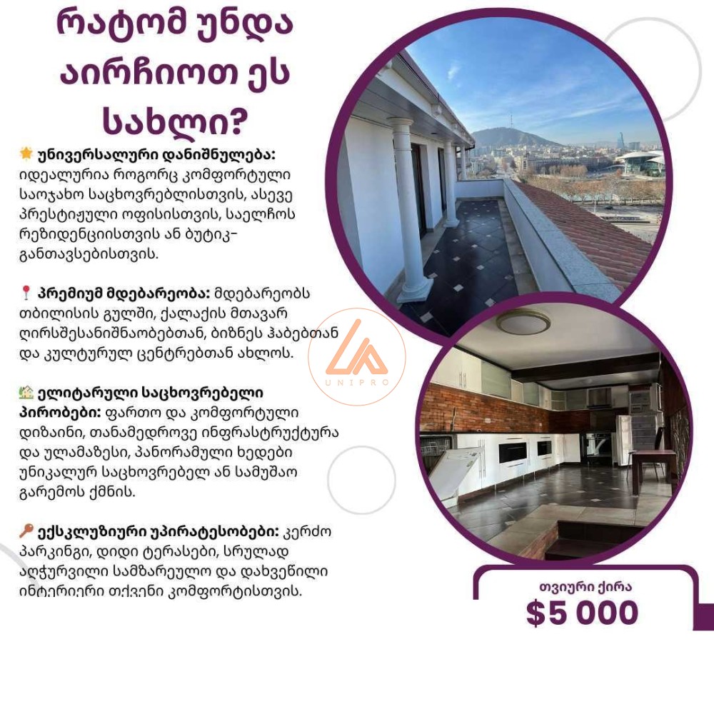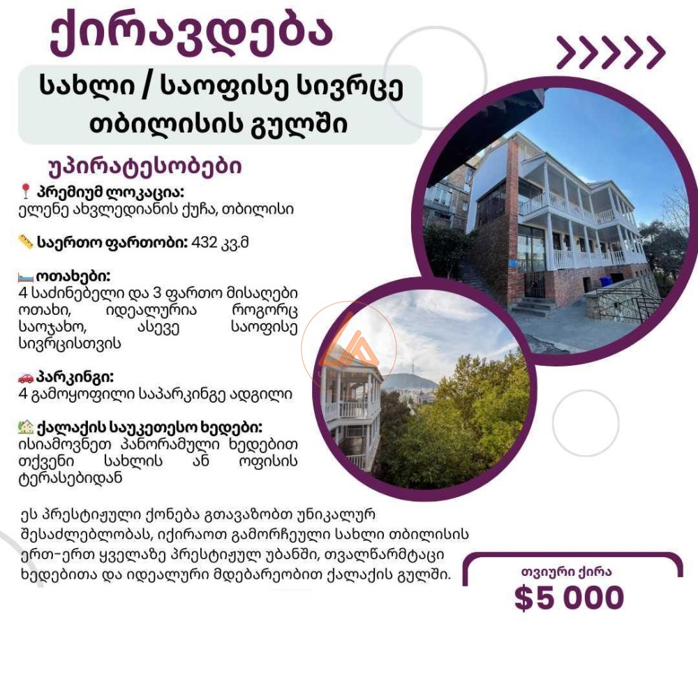 ქირავდება 450 მ² კერძო სახლი ელენე ახვლედიანის ქუჩაზე. ახალი აშენებული, თანამედროვე დიზაინით. სახლი არის ნათელი და კომფორტული, დიდი ფანჯრებით და ლამაზი ხედებით. მდებარეობა გამოირჩევა სიმშვიდითა და კარგი ლოკაციით. დაინტერესების შემთხვევაში გთხოვთ დამიკავშირდეთ განცხადებაში მითითებულ ნომერზე.