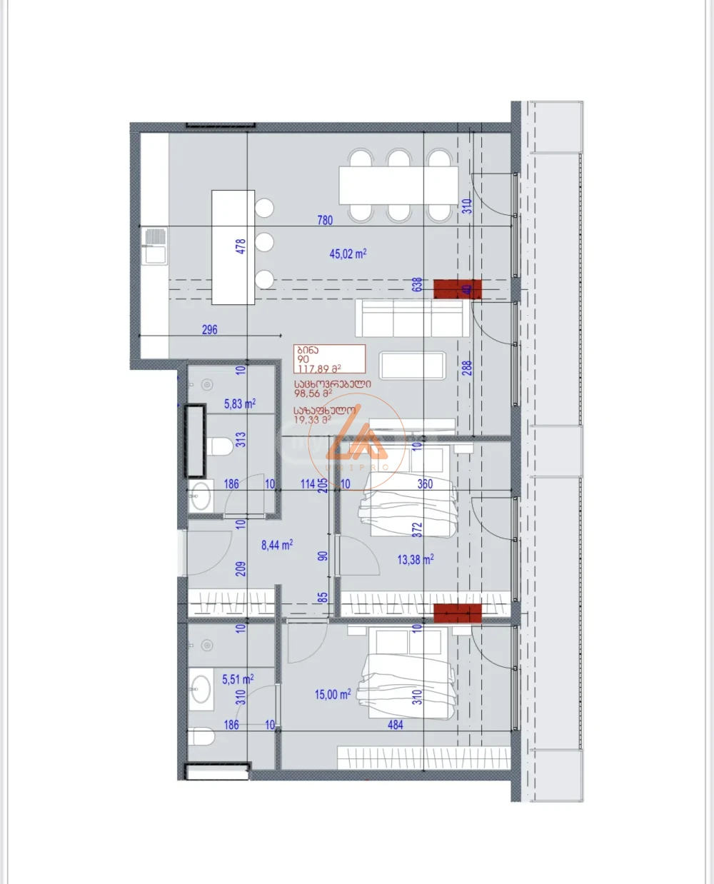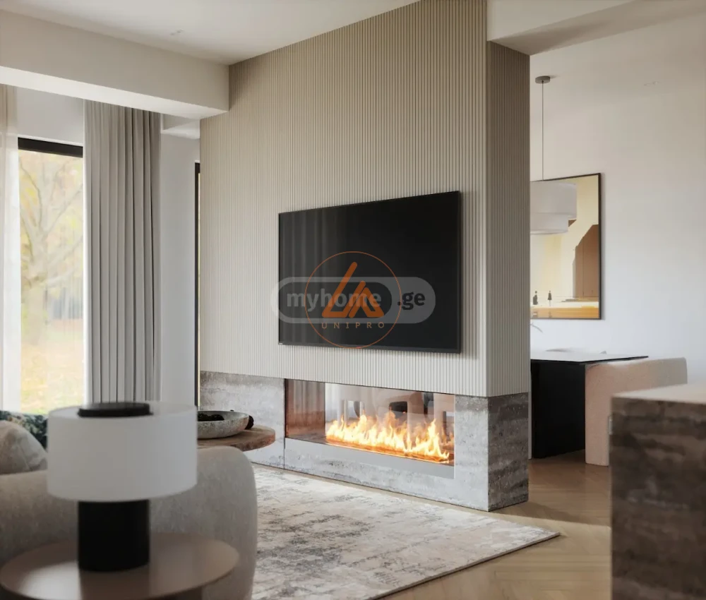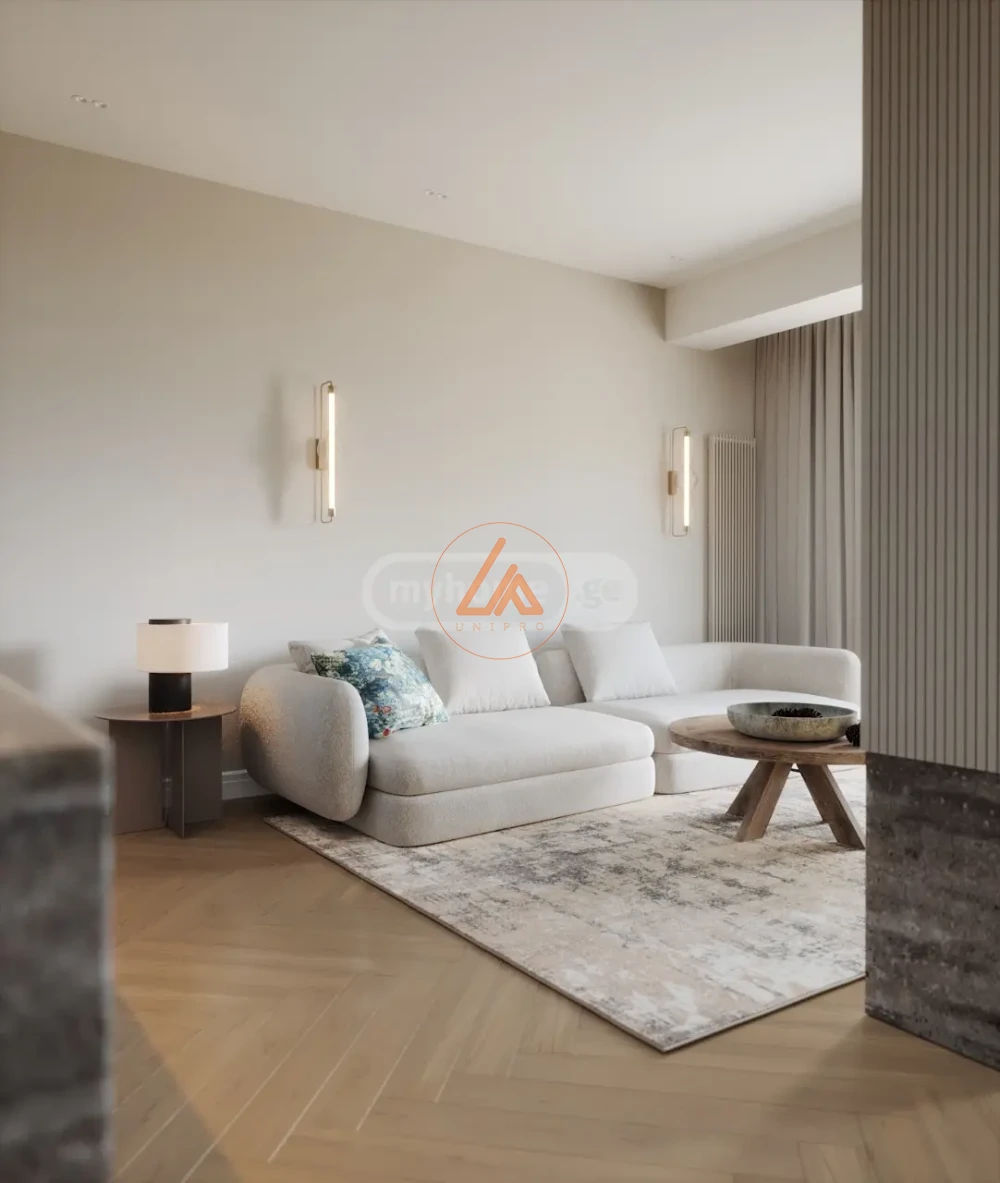 3 ოთახიანი, ორი საძინებელი, აქედან ერთი მასტერ ბედრუმი, ორი სველი წერტილი, სტუდიო მისაღები; ყველა ოთახს აქვს გასასვლელი აივანზე. დიზაინი შექმნიალია კონკრეტულად ამ ბინისთვის