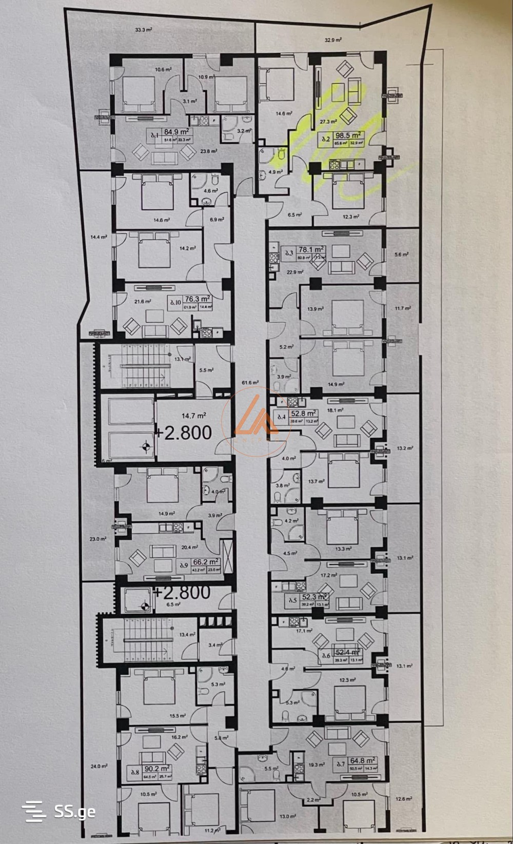 იყიდება ბინა ახალაშენებულ კორპუსში, რომელიც მდებარეობს 16-სართულიანი შენობის მე-2 სართულზე. ბინის საერთო ფართობი შეადგენს 99 კვ.მ-ს და მოიცავს 3 ოთახს, მათ შორის 2 საძინებელს. ბინა გამოირჩევა თანამედროვე დაგეგმარებითა და ახალი შენობის უპირატესობებით, რაც უზრუნველყოფს კომფორტულ და მყუდრო საცხოვრებელ გარემოს. ბინას არ აქვს აივანი, რაც ქმნის მეტ სივრცეს ოთახებში. იდეალური არჩევანია მათთვის, ვინც აფასებს ახალ გარემოსა და ფუნქციურ განლაგებას. აქ შეგიძლიათ შექმნათ თქვენი საოცნებო სახლი და დატკბეთ მშვიდი ცხოვრებით ახალ კორპუსში.