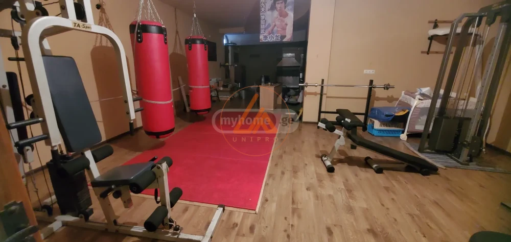 პირველ სართულზე გახლავთ ბუხრის დიდი ოთახი, დიდი წვეულებებისთვის. აქვს თავისი დამატებითი (იზოლირებული) სამზარეულო, მარანი, სარდაფი. ბუხრის ოთახიდან გავდივართ ულამაზეს ეზოში. ამავე სართულზე არის სრულიად აღჭურვილი სპორტ-დარბაზი, ასვე გასასვლელო ავტოფარეხში. ავტოფარეხი დაპროექტებულია მანქანის სამრეცხაო სისტემით და ჭიშკრის წინ არის ასევე საპარკინგე ადგილიც.
