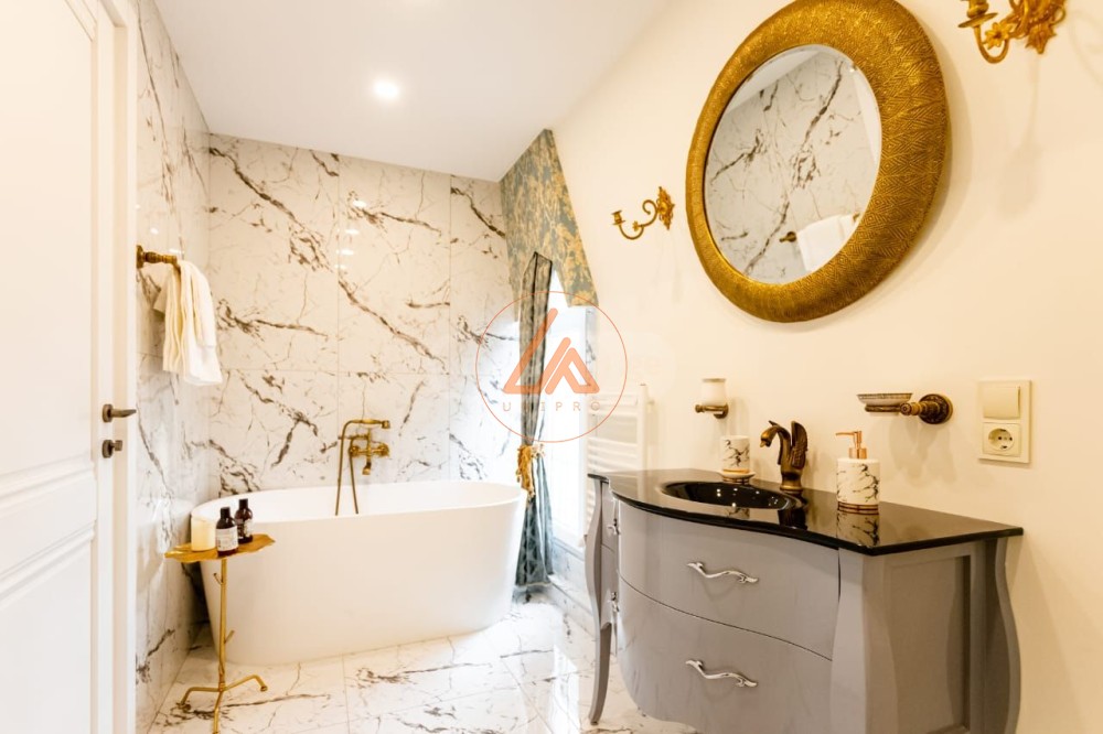7 საძინებლიამი ( შვიდივე საკუთარი სააბაზანო ოთახით, აივნებით და ACთ) , დიდი მისაღები ოთახით, 90 კვ.მ მარნით პარკინგით 1200კვმ ეზო 4 სართულიანი საცხოვრებელი სივრცე შეადგენს 460კვმ