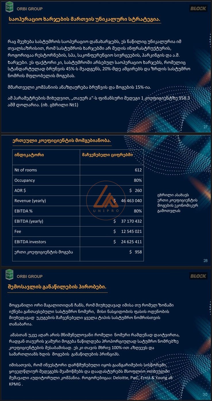 საინვესტიციო შეთავაზება – Radisson-ის მიერ 20 წლით გაქირავებული ნომერი, ყაზბეგის გამზირზე გთავაზობთ უნიკალურ საინვესტიციო ობიექტს ახალაშენებულ Radisson-ის სასტუმროში, სადაც ნომერი უკვე 20 წლით გაქირავებულია საერთაშორისო ბრენდზე. ფასდაკლება დეველოპერზე: დეველოპერის ფასი – 230,000$ საინვესტიციო ფასი – 195,000$ შემოსავალი: ფიქსირებული იჯარა Radisson-ისგან – 2,600$/თვეში წლიური შემოსავალი – 31,200$ ანაზღაურება იწყება 1 წლის შემდეგ ROI ≈ 16%, რაც Radisson-ის სტანდარტებისთვის უჩვეულოდ მაღალია უპირატესობები: გრძელვადიანი, სტაბილური და გარანტირებული პასიური შემოსავალი რისკის მინიმუმი – იჯარას სრულად იხდის Radisson მზარდი ლოკაცია (ყაზბეგის გამზირი) და ქონების მაღალი აღქმა ობიექტის ღირებულების პროგნოზირებული ზრდა ოპერირებასთან ერთად 20 წელიწადში საერთო მიღებული თანხა ≈ 624,000$ ეს არის იშვიათი შესაძლებლობა შეიძინოთ მაღალი რეიტინგის, ბრენდულ სასტუმროში გარანტირებული შემოსავლის მქონე უძრავი ქონება ბაზარზე დაბალ ფასად.