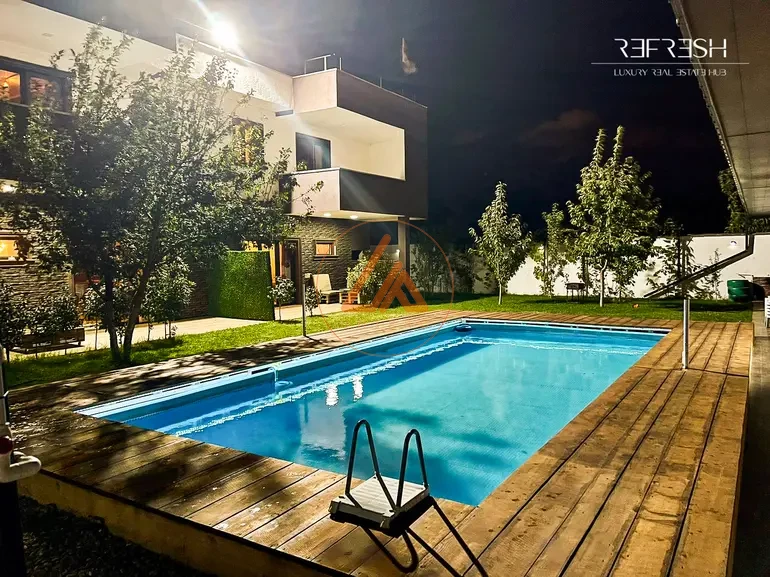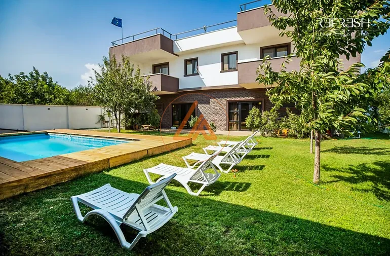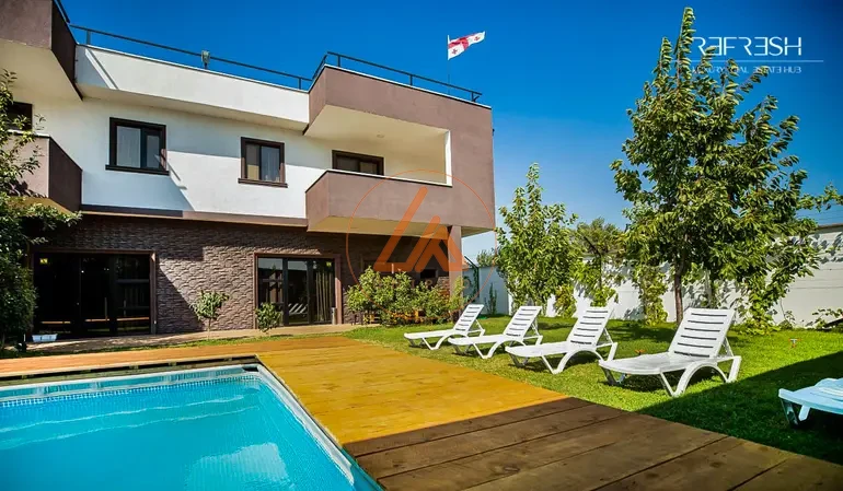 იყიდება ახალი აშენებული, ოფიციალურად დარეგისტრირებული და ექსპლუატაციაში შეყვანილი, თანამედროვე დიზაინის მქონე,მრაცალფუნქციური,კეთილმოწყობილი საცხოვრებელ დასასვენებელი კომპლექსი, რომელიც შედგება: 1. ორი იზოლირებული საცხოვრებელის სახლისგან 2. 10x5 საცურაო აუზი 3. ეზოში მდგარი დამხმარე შენობა ნაგებობა 4. ორი დამოუკიდებელი ავტოფარეხი საცხოვრებელი სახლი მოიცავს ორ იზოლირებულ ბინას (განლაგებული სარკისებრი პრინციპით) თითოეულ შედგება 4 საძინებლისგან, პირველ სართულზე დიდი მისაღებისგან (88კვ.მ)